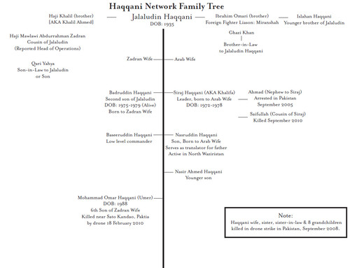 Alguns daqueles elementos são familiares directos de Sirajuddin, o qual assumiu a liderança da rede em 2008, fundada pelo seu pai, Jalaluddin, há mais de 30 anos, e que permanece ainda na cúpula da organização. Os Haqqanis pertencem à tribo Zadran, do leste do Afeganistão.