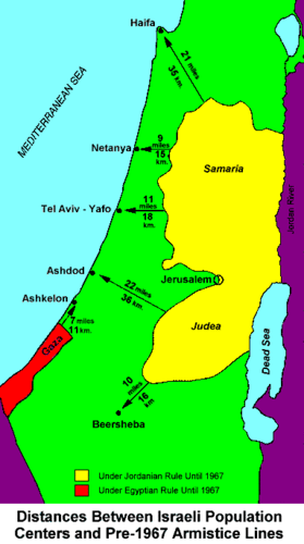 É preciso relembrar que até 1967, ano em que Israel expandiu substancialmente as suas fronteiras com a Guerra dos Seis Dias, um dos grandes dramas daquele Estado era o problema da “profundidade estratégica”. Note-se que durante aquelas quase duas décadas a zona mais estreita de Israel tinha apenas 15 Km de largura, ou seja, de terra a separar o Mar Mediterrâneo e os territórios palestinianos da Cisjordânia.