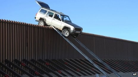 Esta semana as autoridades americanas avistaram dois traficantes em pleno delito, quando tentavam entrar na Califórnia com um jipe, de uma forma que tinha tanto de imaginativa como de tola. Perante o alerta, os dois traficantes meteram-se em fuga com os supostos sacos de droga de volta ao México, abandonando o jipe literalmente atascado em cima da vedação.