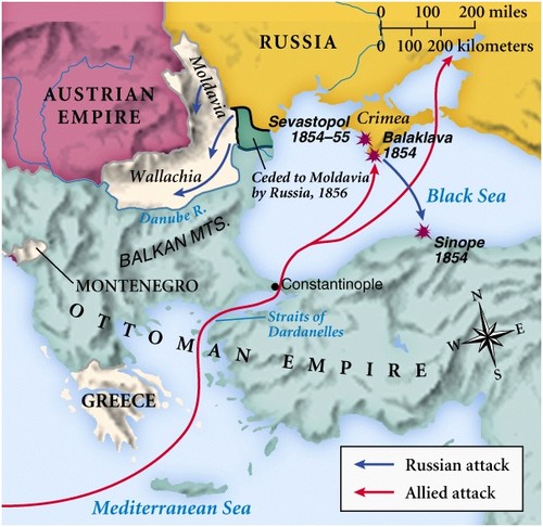 Vejam-se os acontecimentos que levaram à Guerra da Crimeia de 1853-56. O pretexto teve a ver com a distribuição dos lugares santos entre as comunidades católica e ortodoxa do Império Otomano, mas a questão principal era o antagonismo entre as potências ocidentais e a Rússia quanto às zonas de influência a Oriente da Europa. Perante um Império Otomano que o Czar Nicolau I considerava moribundo, a Rússia queria assegurar protectorados sobre os povos cristãos ortodoxos que ainda estavam sob a governação do Sultão.